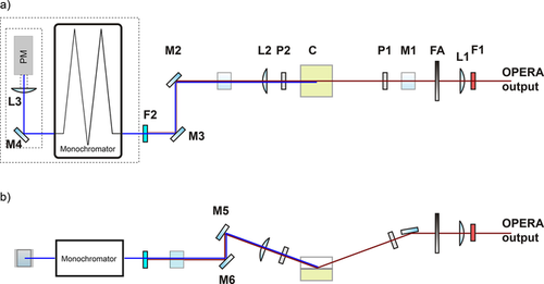 Figure Legend: a) Simplified top view of the experimental setup for SHG measurements: F1, long pass filter; L1‐L3, lenses; FA, adjustable neutral density filter; P1, P2, polarizers; C, sample cell; M1‐M6, mirrors; F2, short pass filter; PM, photomultiplier; b) side view of the same setup.